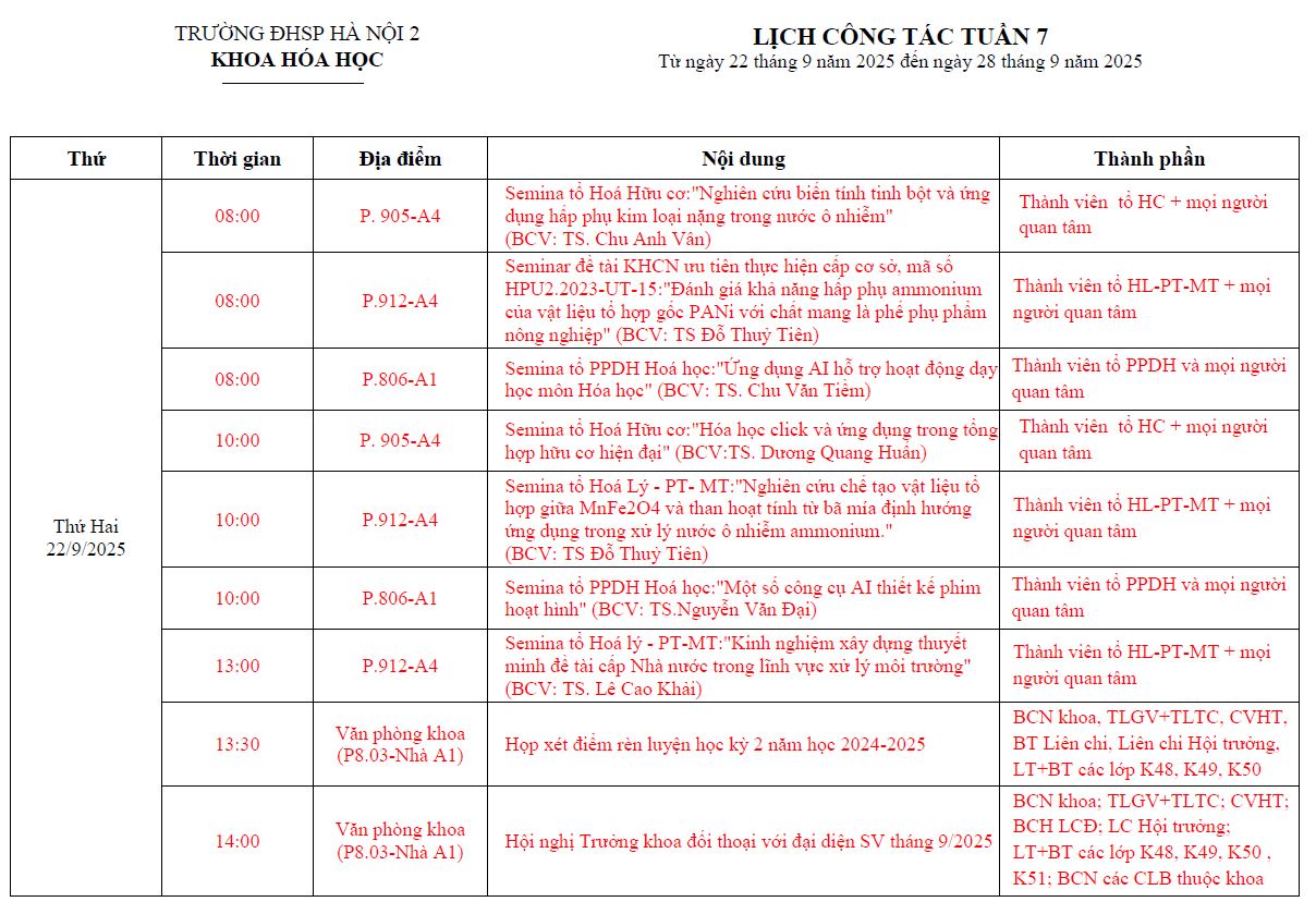 Lịch công tác tuần 07, năm học 2025 - 2026