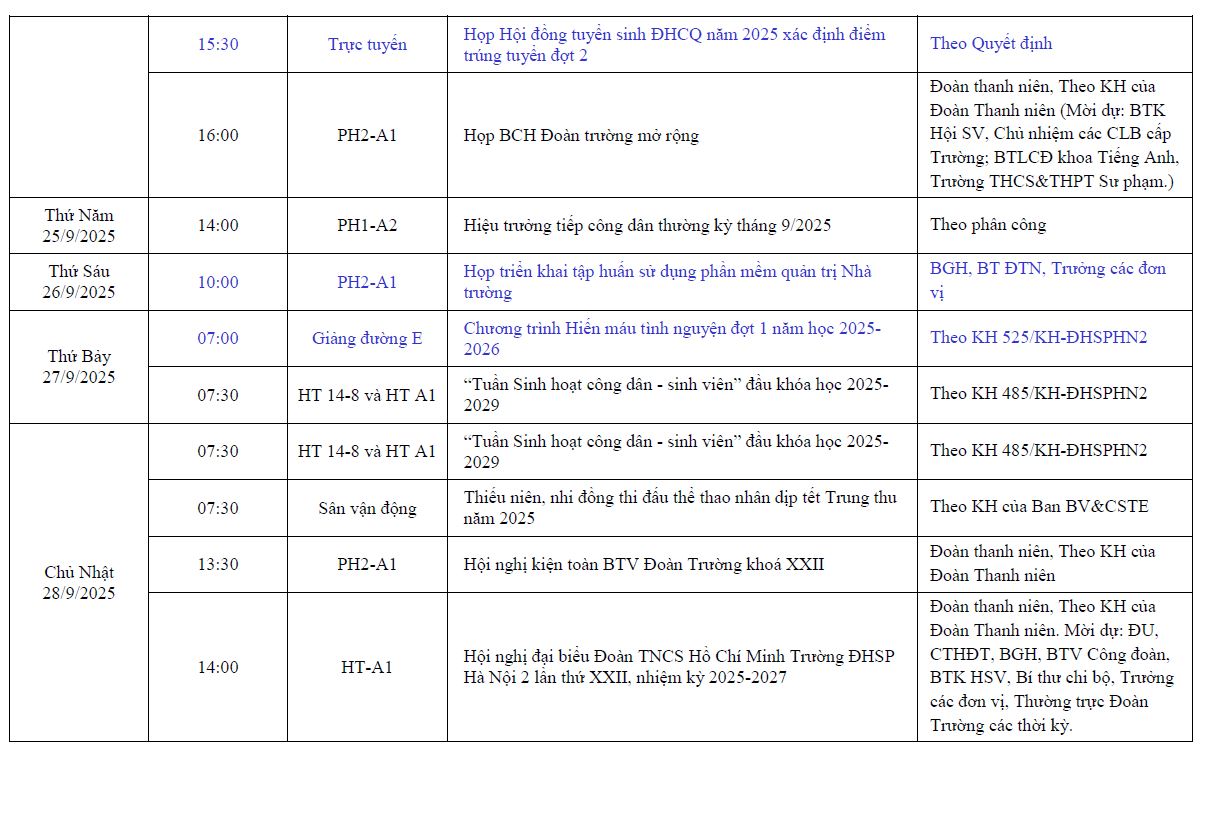 Lịch công tác tuần 02, năm học 2025 - 2026