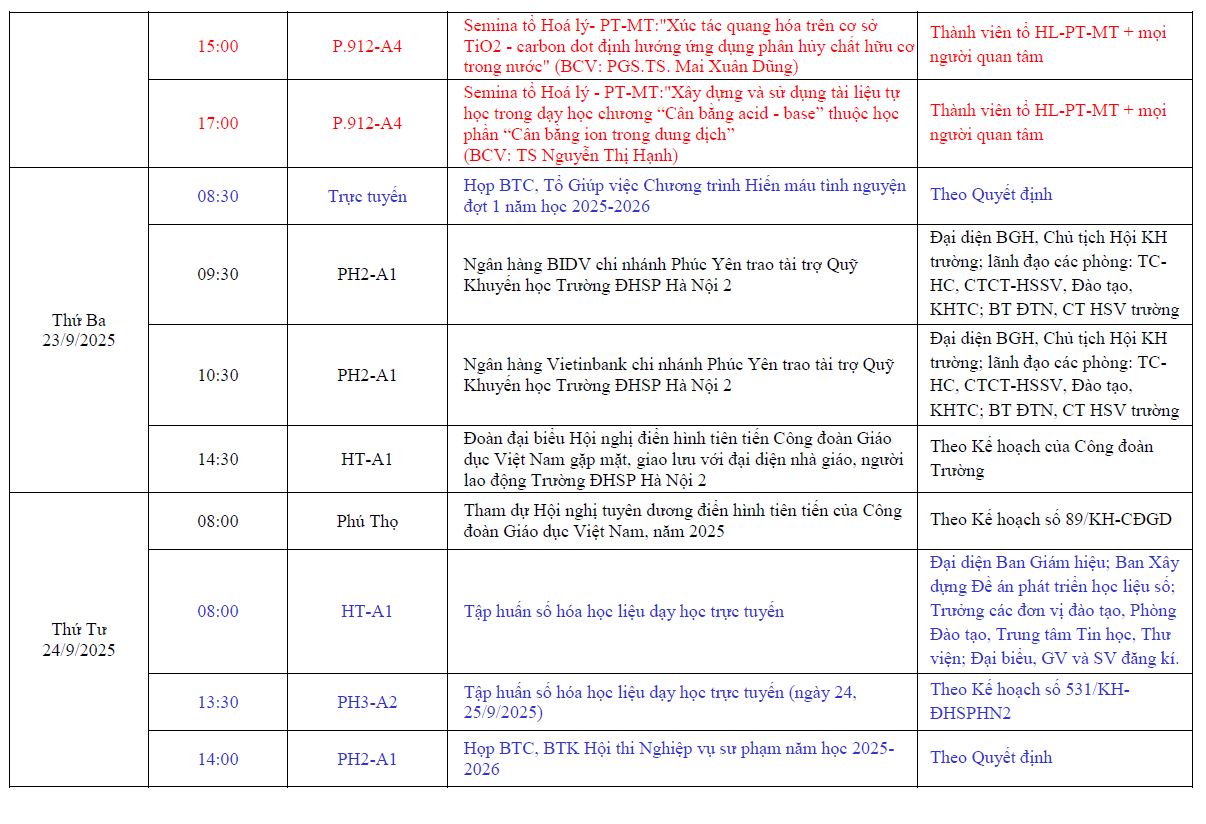 Lịch công tác tuần 09, năm học 2025 - 2026