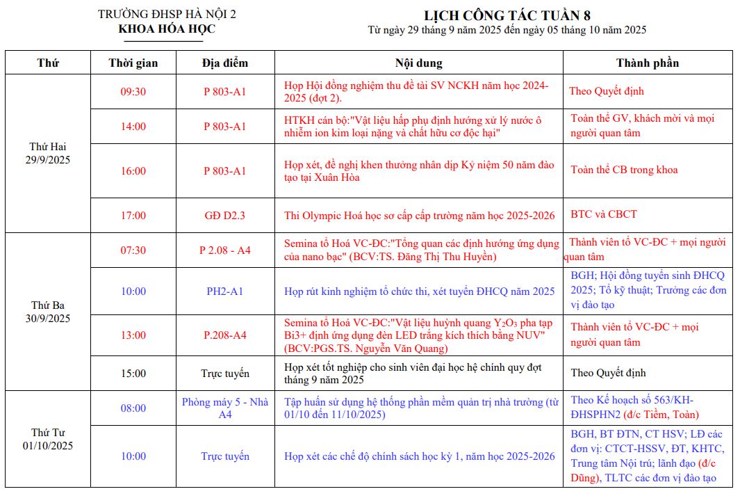 Lịch công tác tuần 08, năm học 2025 - 2026
