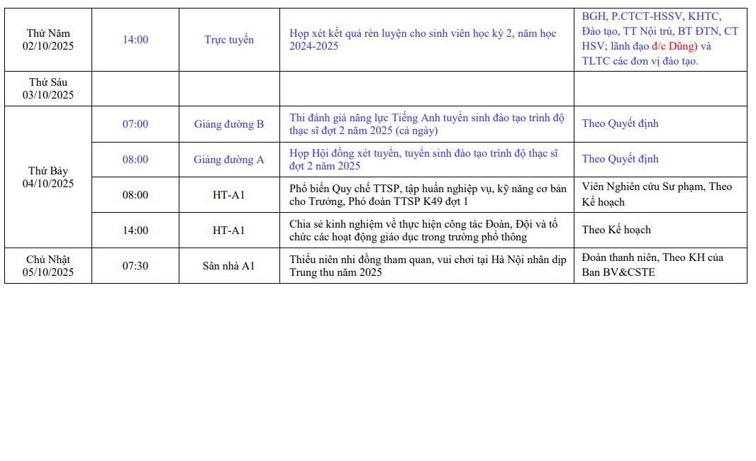 Lịch công tác tuần 05, năm học 2025 - 2026