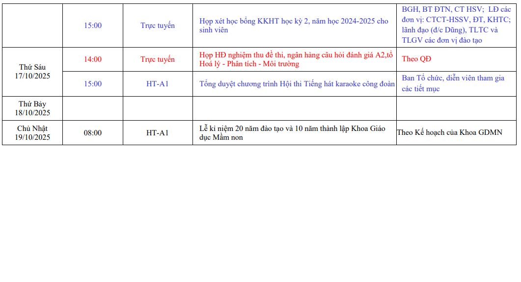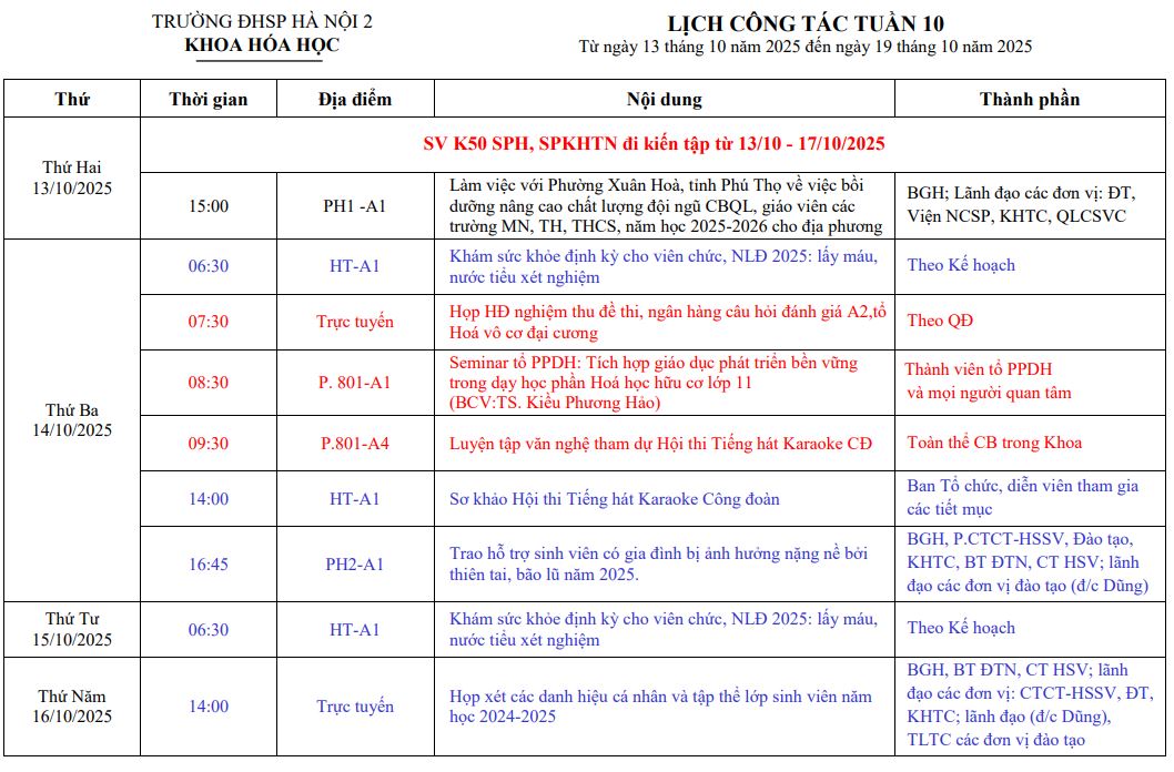 Lịch công tác tuần 10, năm học 2025 - 2026