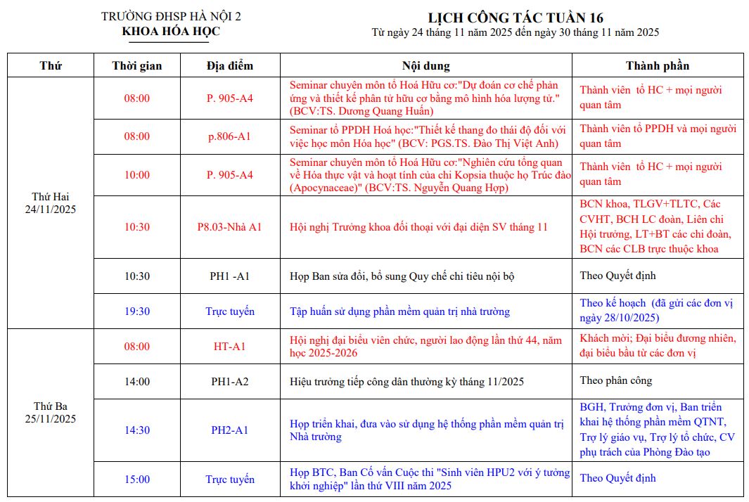 Lịch công tác tuần 16, năm học 2025 - 2026