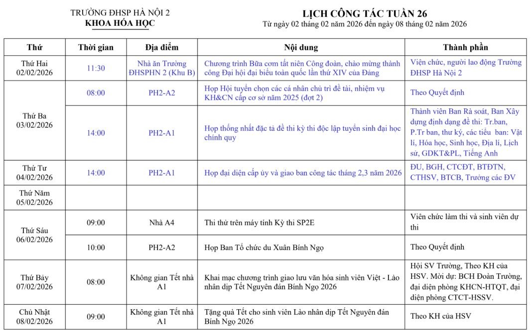 Lịch công tác tuần 26, năm học 2025 - 2026