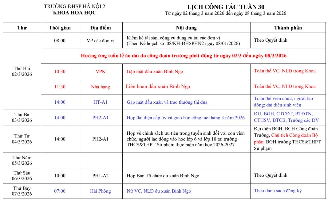 Lịch công tác tuần 30, năm học 2025 - 2026
