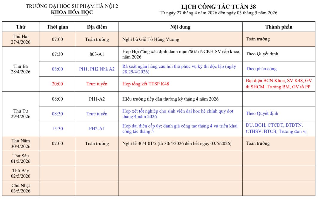 Lịch công tác tuần 37, năm học 2025 - 2026