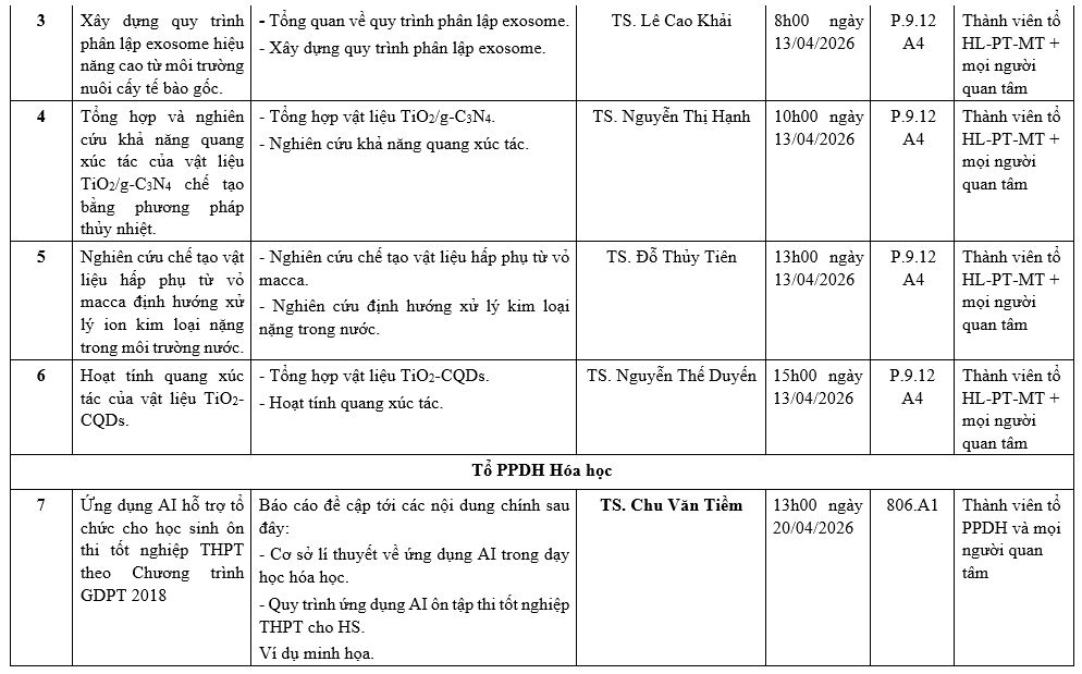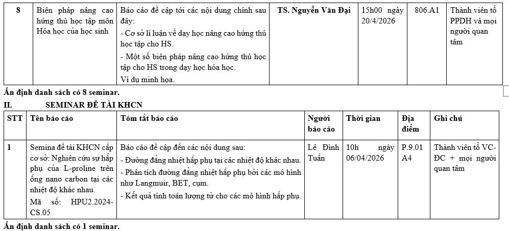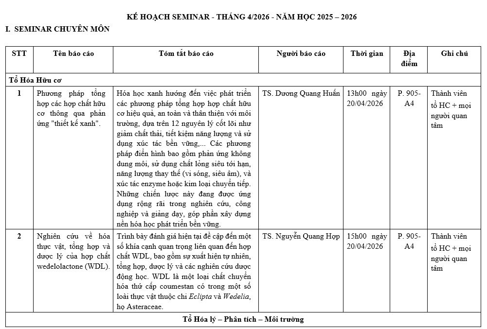 Lịch seminar tháng 4/2026, năm học 2025 - 2026